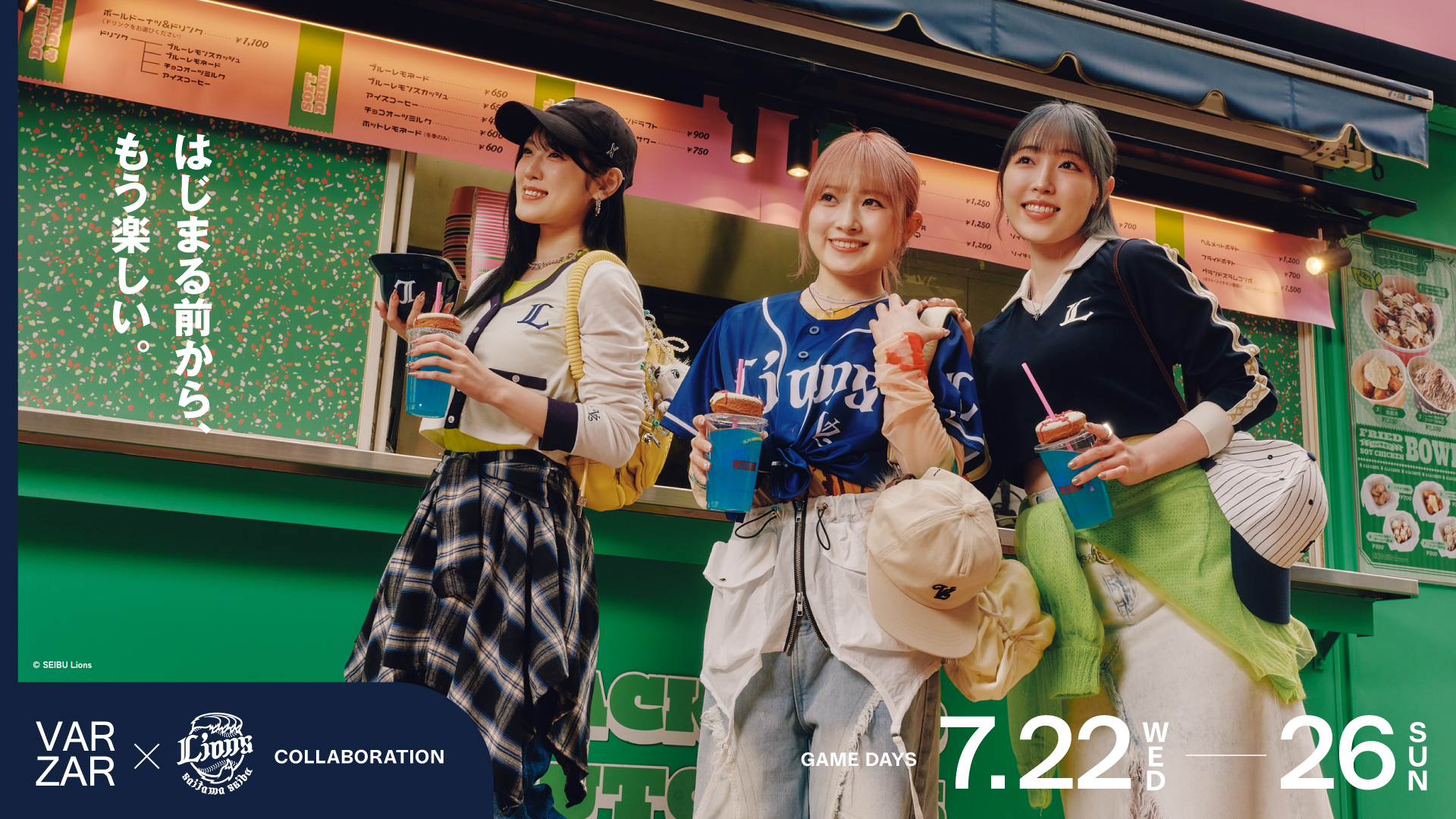 本ビジュアルは、4月にベルーナドームで撮影いたしました。7 月25日(土)の福岡ソフトバンクホークス戦で来場者全員に配布する「VARZAR×LIONSコラボレーションユニフォーム」のほか、現在販売中のコラボグッズを身につけ、自分の好きなスタイルで野球観戦やグルメを楽しむ姿が印象的なビジュアルに仕上げました。