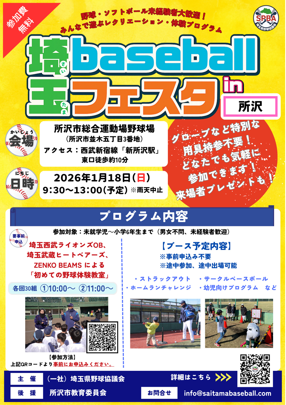 一般社団法人埼玉県野球協議会は、1月18日(日)に「第4回埼玉baseballフェスタ in 所沢」を所沢市総合運動場野球場にて開催します。