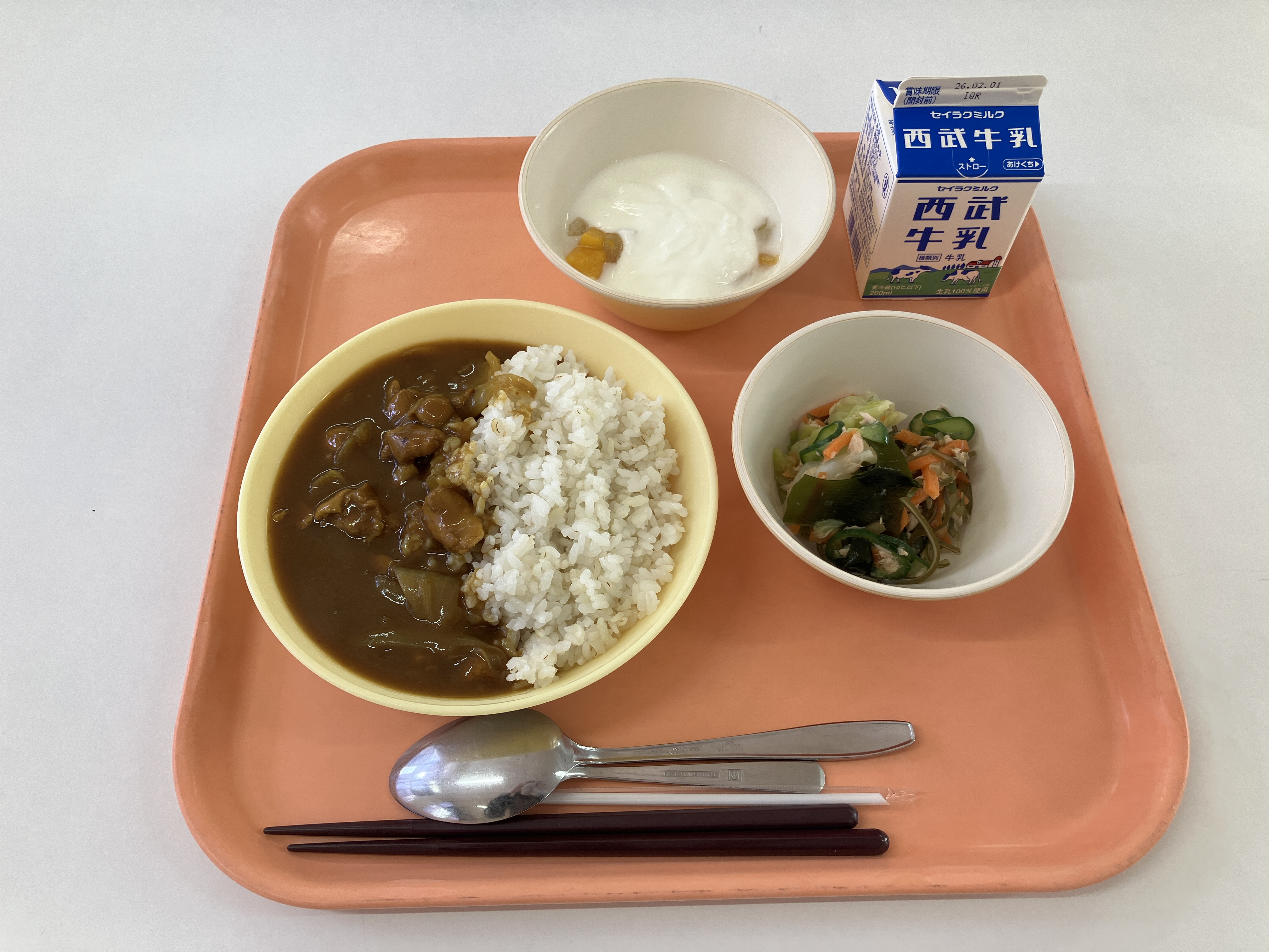 この日のメニューは、若獅子カレー(むぎごはん)、海藻ツナサラダ、フルーツヨーグルト、牛乳です。