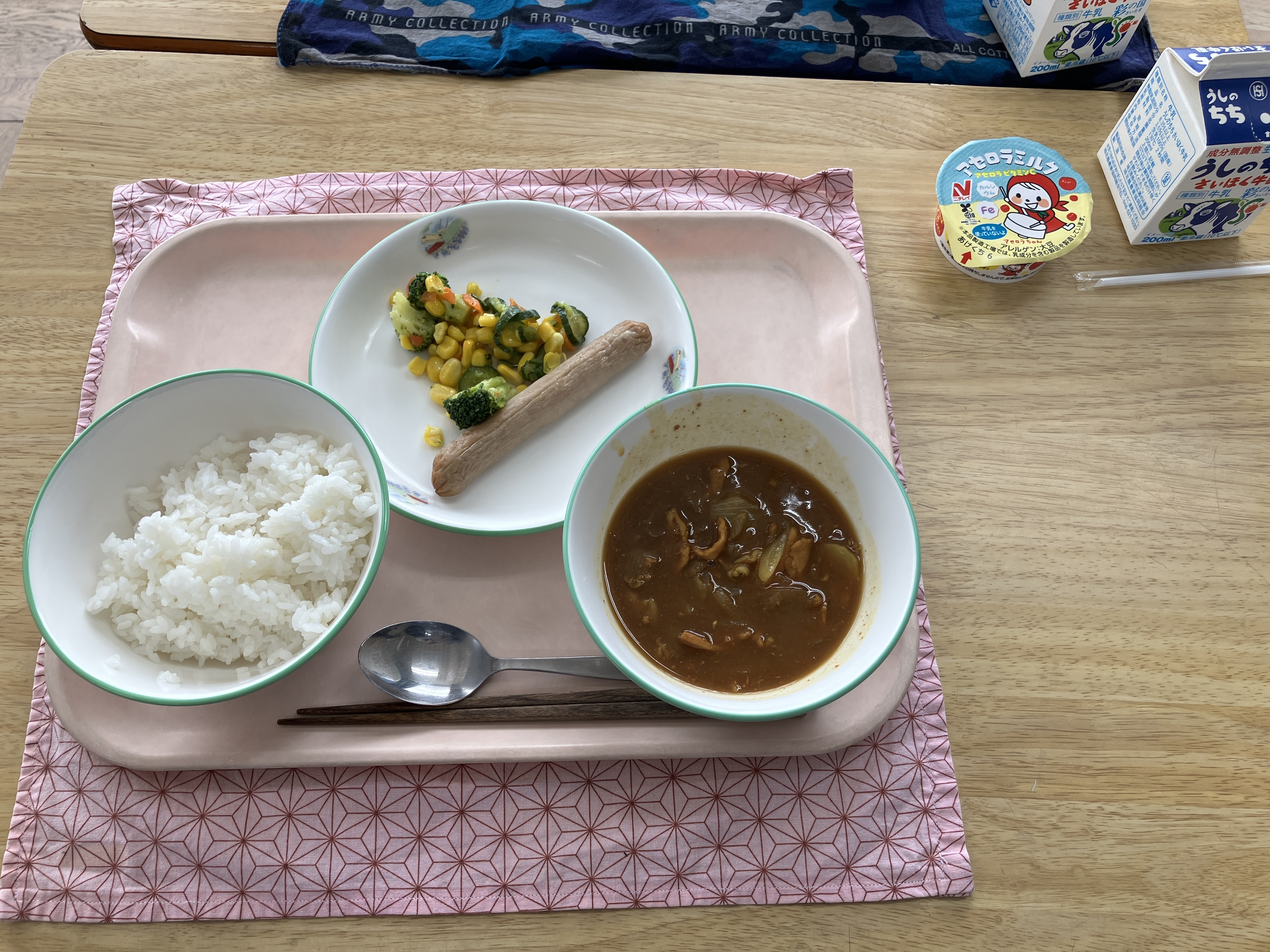 この日のメニューは、若獅子カレー、白飯、粗びきロングウインナー、カラフルサラダ、アセロラミルクゼリー、牛乳です。